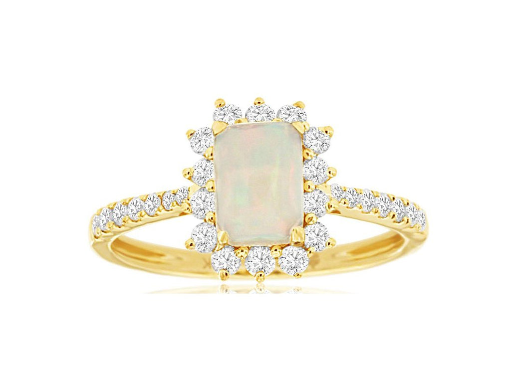 14KT YELLOW GOLD ENAGAGEMNT RING. 3D HALO SQUARE DESIGN. ROUND DIAMONDS ARE F/G COLOR, VSSI CLARITY .48 CARATS. AAA CUSHION CUT OPAL IS .70 CARATS. RING SIZE 7. CAN BE SIZED BY OUR MASTER JEWELER UPON REQUEST. WRITTEN APPRAISAL AVAILABLE. COMES IN A PRESENTABLE GIFT BOX.