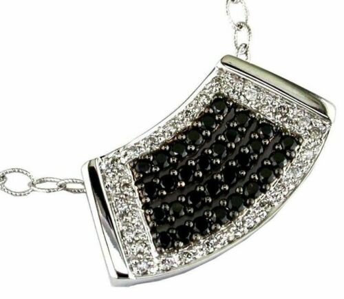 14KT WHITE GOLD FUN PENDANT. 3D MULTI ROW TRIANGULAR DESIGN. WHITE DIAMONDS ARE F/G COLOR, VSSI CLARITY .28 CARATS. BLACK DIAMONDS ARE .90 CARATS. COMES ON A 14KT GOLD DIAMOND CUT 16" INCH CHAIN. WRITTEN APPRAISAL AVAILABLE. COMES IN A PRESENTABLE GIFT BOX.