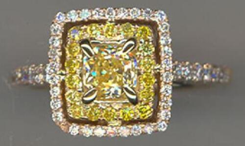 18KT WHITE AND YELLOW GOLD ENGAGEMENT RING. 3D SQUARE DOUBLE HALO DESIGN. ROUND WHITE DIAMONDS ARE F/G COLOR, VSSI CLARITY .32 CARATS. FANCY YELLOW CUSHION CUT DIAMONDS ARE .86 CARATS. RING SIZE 7. CAN BE SIZED BY OUR MASTER JEWELER UPON REQUEST. WRITTEN APPRAISAL AVAILABLE. COMES IN A PRESENTABLE GIFT BOX.