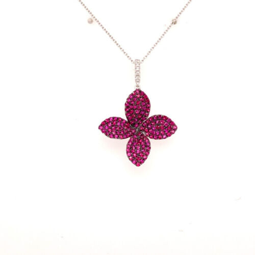 18KT WHITE GOLD FLOATING PENDANT. 3D MULTI LEAF FLOWER DESIGN. DIAMONDS ARE F/G COLOR, VSSI CLARITY .03 CARATS. AAA RUBIES ARE 1.16 CARATS. COMES ON A 14KT GOLD DIAMOND CUT 16" INCH CHAIN. WRITTEN APPRAISAL AVAILABLE. COMES IN A PRESENTABLE GIFT BOX.
