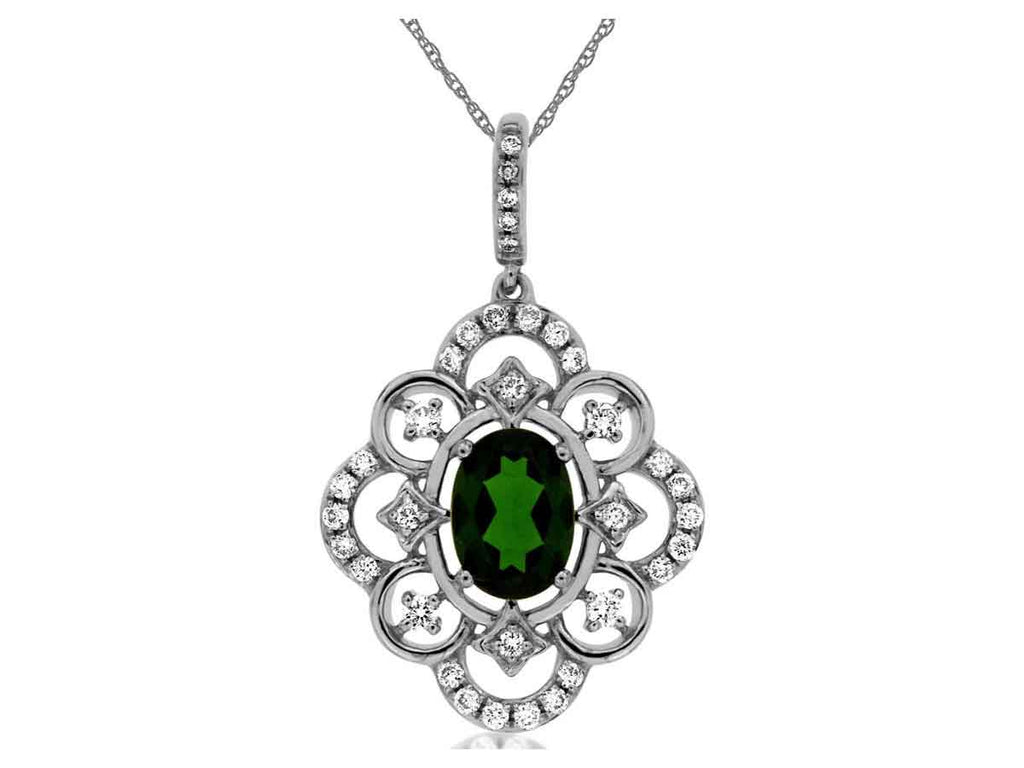 14KT WHITE GOLD FLOATING PENDANT. 3D FILIGREE FLOWER DESIGN. ROUND DIAMONDS ARE F/G COLOR, VSSI CLARITY .24 CARATS. AAA EXTRA FACETED OVAL RUSSALITE IS .95 CARATS. COMES ON A 14KT GOLD DIAMOND CUT 16" INCH CHAIN. WRITTEN APPRAISAL AVAILABLE. COMES IN A PRESENTABLE GIFT BOX.