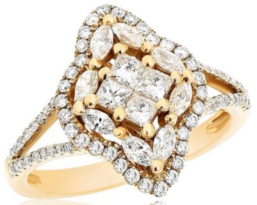 14KT YELLOW GOLD FUN RING. 3D INVISIBLE FLOWER DESIGN. DIAMONDS ARE F/G COLOR, VSSI CLARITY. ROUND DIAMONDS ARE .38 CARATS. MARQUISE SHAPE DIAMONDS ARE .35 CARATS. PRINCESS CUT DIAMONDS ARE .37 CARATS. RING SIZE 7. CAN BE SIZED BY OUR MASTER JEWELER UPON REQUEST. WRITTEN APPRAISAL AVAILABLE. COMES IN A PRESENTABLE GIFT BOX.