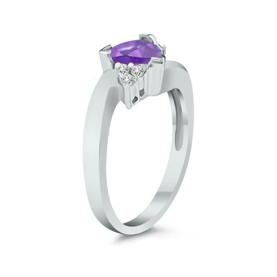 14KT WHITE GOLD FUN RING. 3D CRISS CROSS DESIGN. ROUND DIAMONDS ARE G/H COLOR, SI CLARITY .10 CARATS. AAA EXTRA FACETED TRILLION CUT AMETHYST IS 1.0 CARAT. RING SIZE 6.5. CAN BE SIZED BY OUR MASTER JEWELER UPON REQUEST. WRITTEN APPRAISAL AVAILABLE. COMES IN A PRESENTABLE GIFT BOX.
