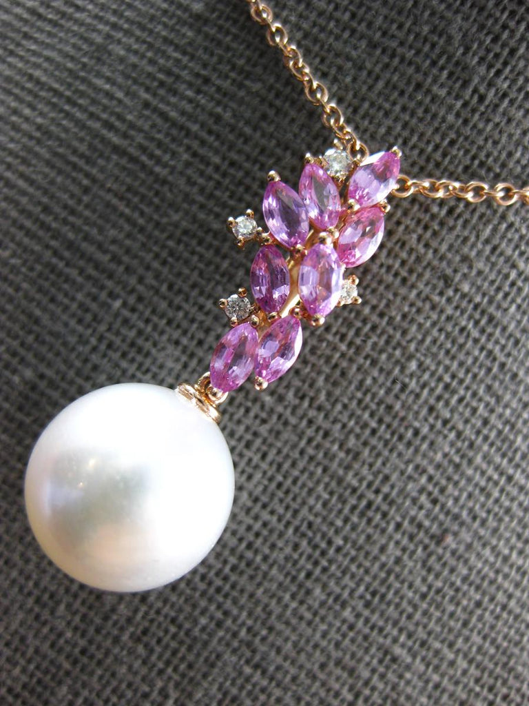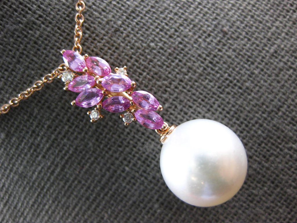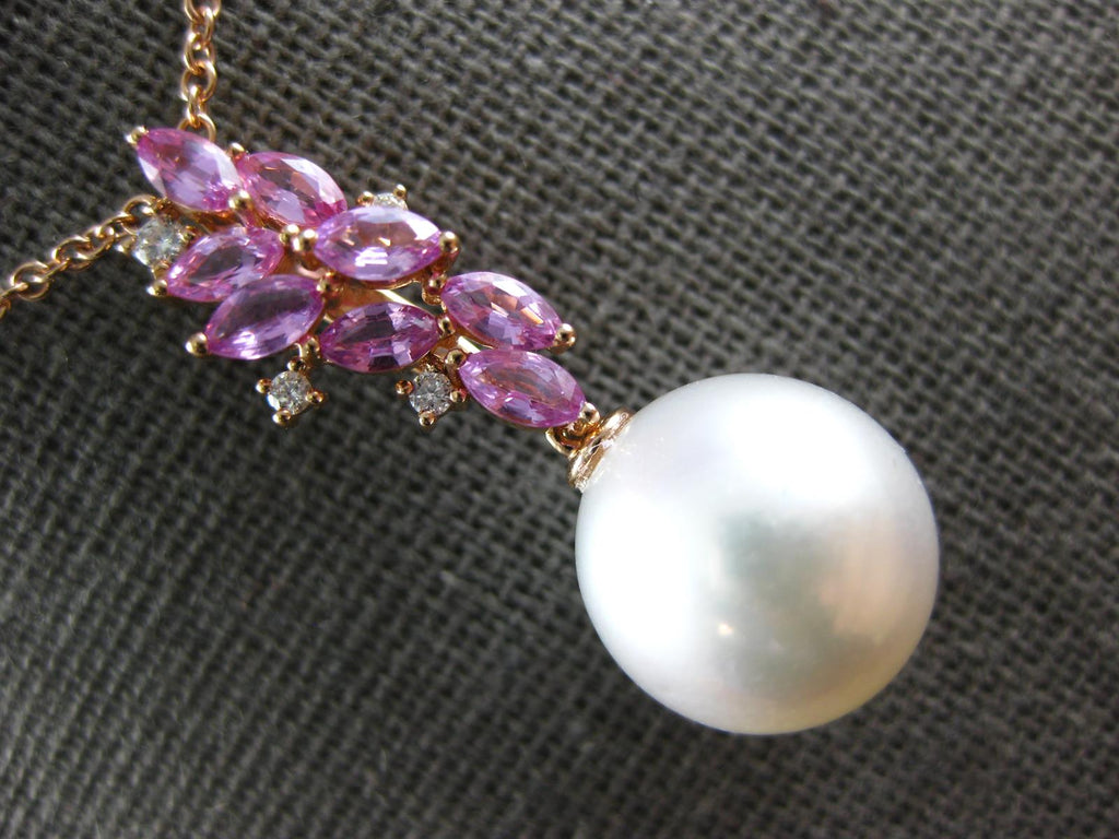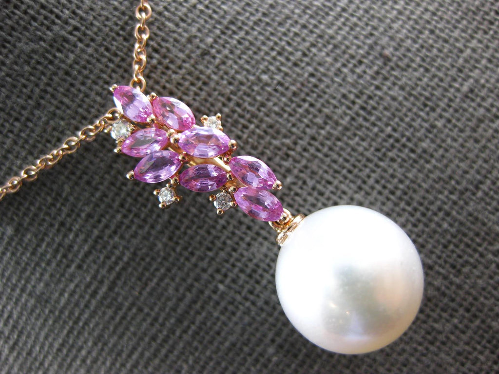 18KT ROSE GOLD FLOATING PENDANT. 3D MULTI LEAF DESIGN. DIAMONDS ARE F/G COLOR, VS CLARITY .07 CARATS. AAA MARQUISE PINK SAPPHIRES ARE 1.03 CARATS. FEATURES AAA SOUTH SEA PEARL. MEASURES 32mm X 12.5mm. COMES ON A 14KT GOLD DIAMOND CUT 16" INCH CHAIN. WRITTEN APPRAISAL AVAILABLE. COMES IN A PRESENTABLE GIFT BOX.