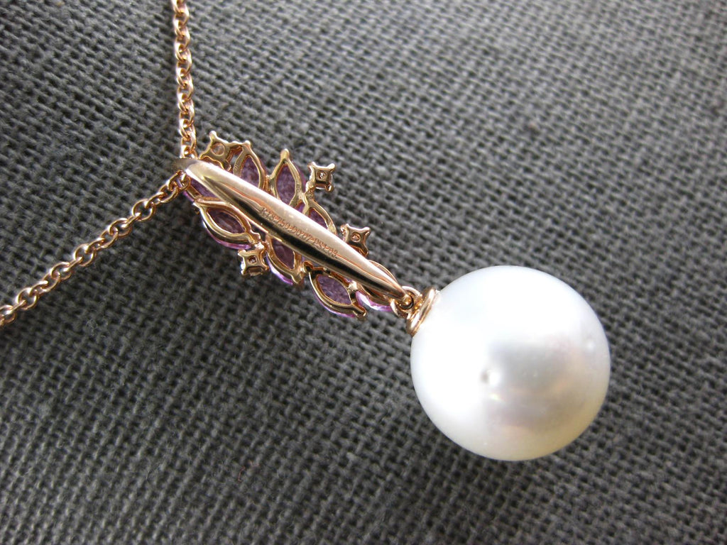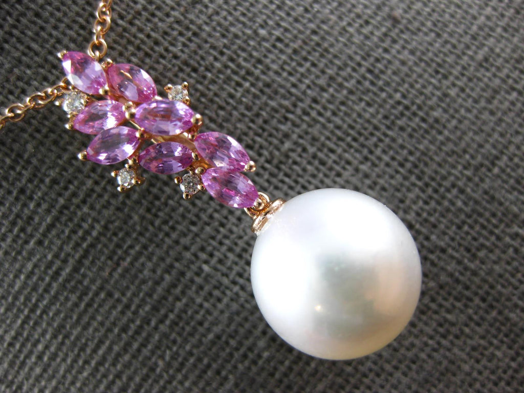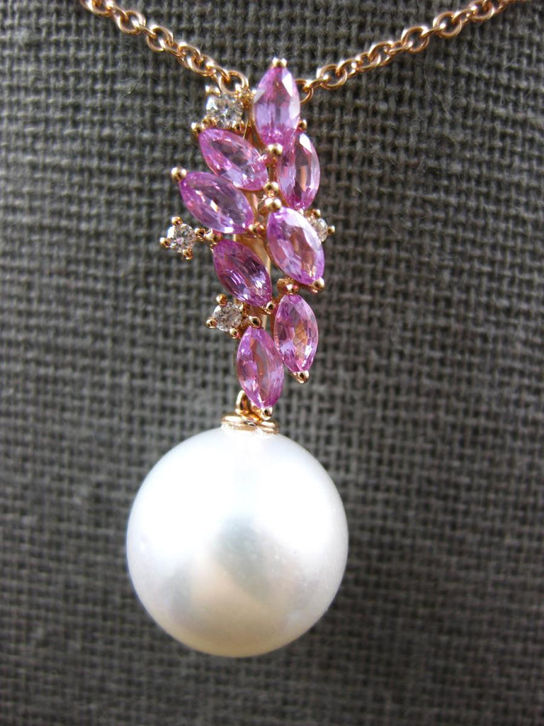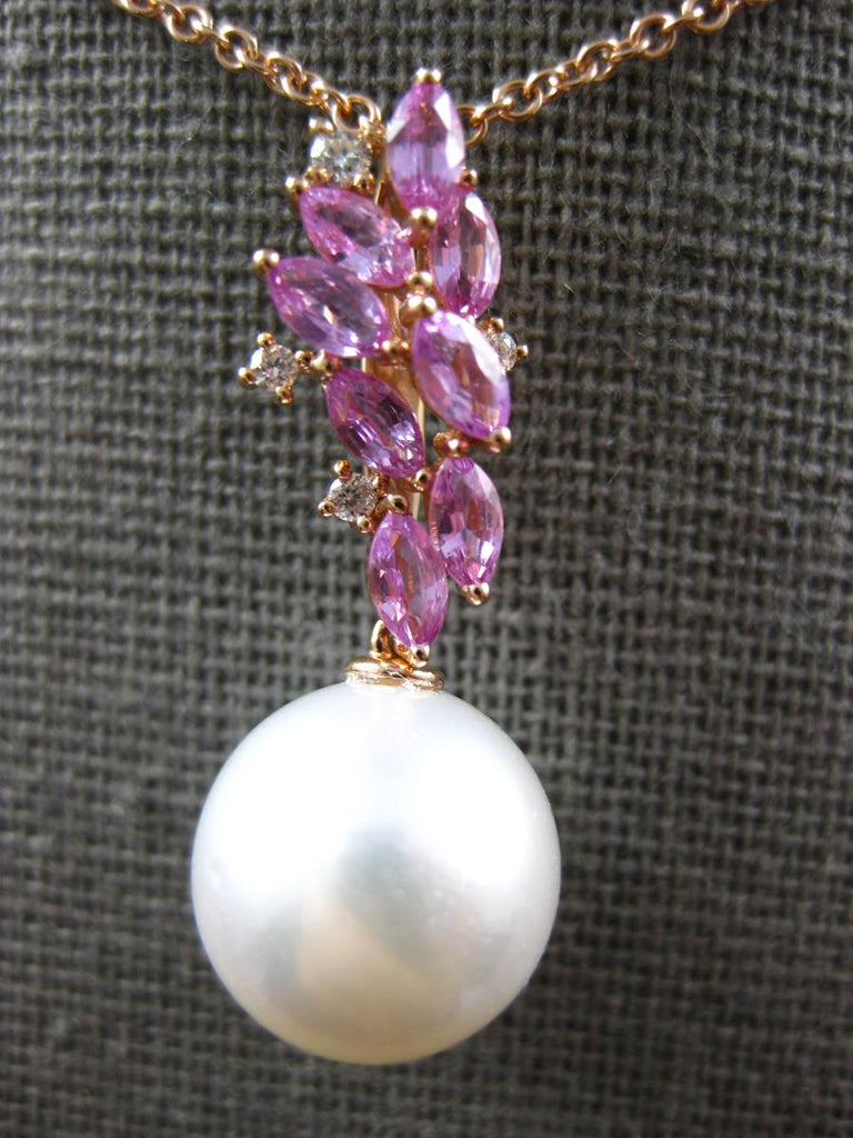 18KT ROSE GOLD FLOATING PENDANT. 3D MULTI LEAF DESIGN. DIAMONDS ARE F/G COLOR, VS CLARITY .07 CARATS. AAA MARQUISE PINK SAPPHIRES ARE 1.03 CARATS. FEATURES AAA SOUTH SEA PEARL. MEASURES 32mm X 12.5mm. COMES ON A 14KT GOLD DIAMOND CUT 16" INCH CHAIN. WRITTEN APPRAISAL AVAILABLE. COMES IN A PRESENTABLE GIFT BOX.
