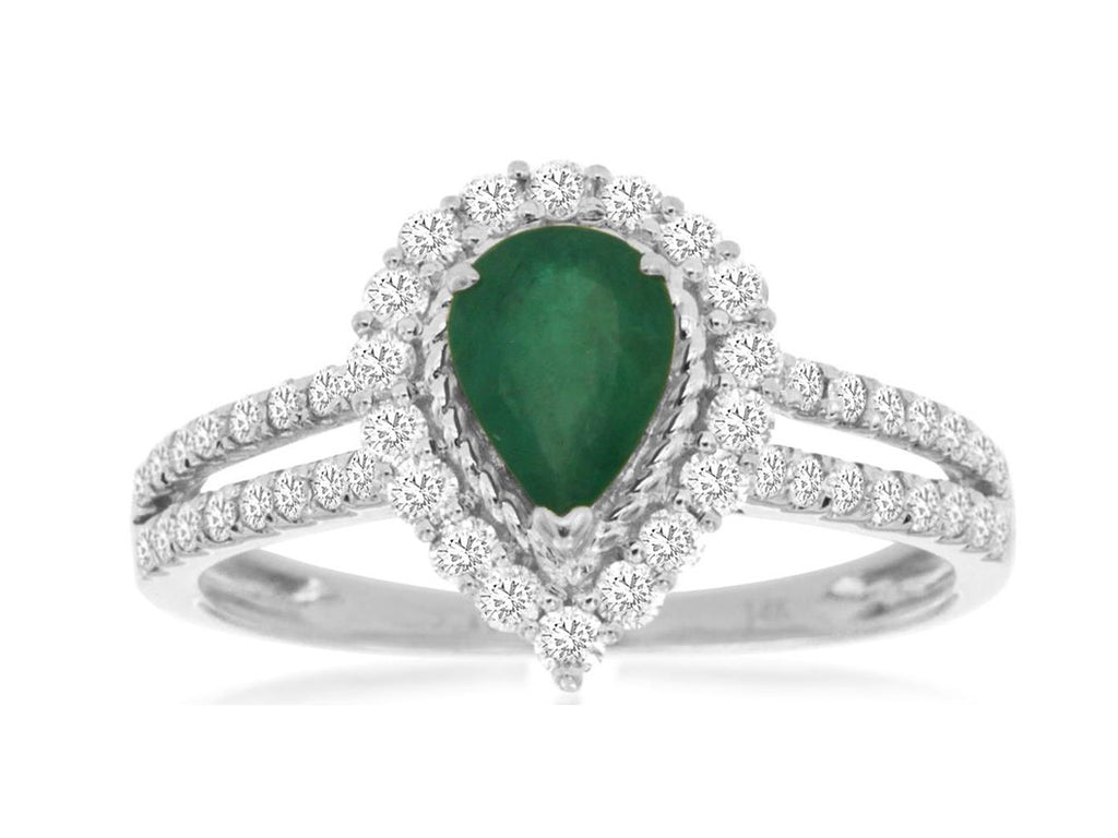 14KT WHITE GOLD FRIENDSHIP PROMISE RING. 3D HALO CLASSIC DESIGN. ROUND DIAMONDS ARE F/G COLOR, VSSI CLARITY .52 CARATS. AAA PEAR SHAPE EMERALD IS .68 CARATS. RING SIZE 7. CAN BE SIZED BY OUR MASTER JEWELER UPON REQUEST. WRITTEN APPRAISAL AVAILABLE. COMES IN A PRESENTABLE GIFT BOX.
