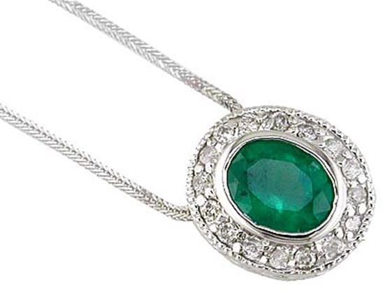 14KT WHITE GOLD FLOATING PENDANT. 3D HALO DESIGN. ROUND DIAMONDS ARE F/G COLOR, VSSI CLARITY 0.25 CARATS. AAA OVAL EMERALD IS .95 CARATS.COMES ON A 14KT GOLD DIAMOND CUT 16" INCH CHAIN.WRITTEN APPRAISAL AVAILABLE. COMES IN A PRESENTABLE GIFT BOX.