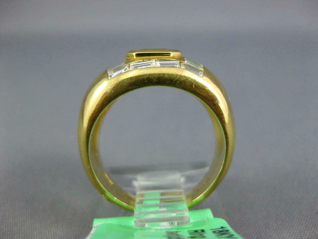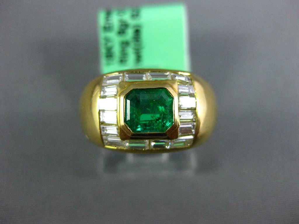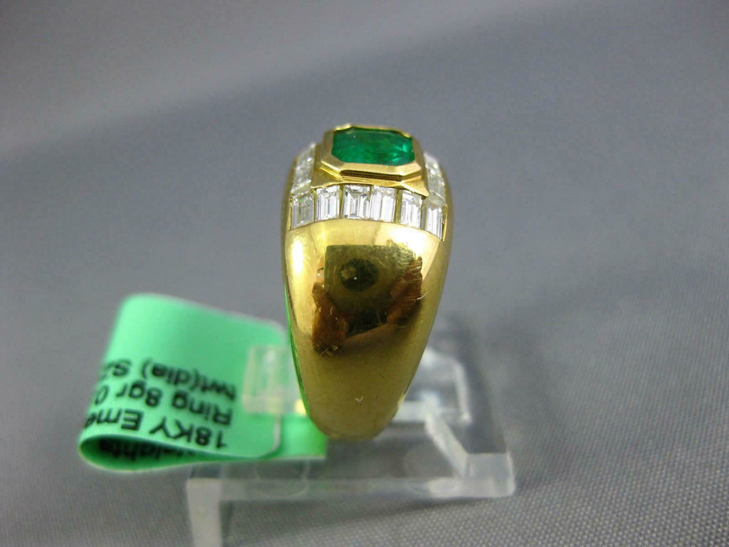 18KT YELLOW GOLD ENGAGEMENT RING. 3D MULTI ROW BEZEL DESIGN. BAGUETTE DIAMONDS ARE F/G COLOR, VSSI CLARITY .60 CARATS. AAA EMERALD IS .60 CARATS. MEASURES 10mm WIDE. RING SIZE 4.5. CAN BE SIZED BY OUR MASTER JEWELER UPON REQUEST. WRITTEN APPRAISAL AVAILABLE. COMES IN A PRESENTABLE GIFT BOX.