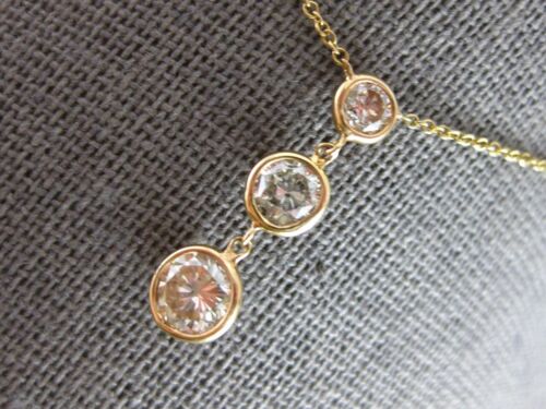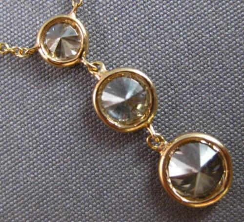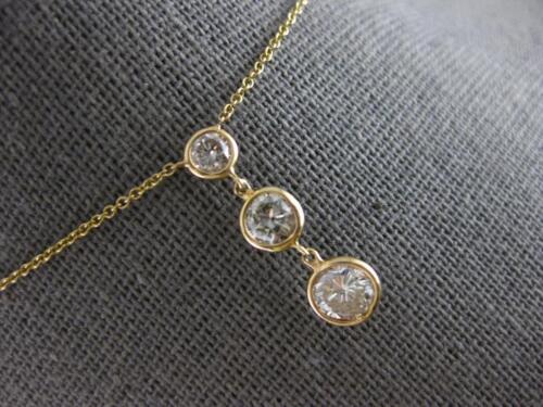 14KT YELLOW GOLD LARIAT NECKLACE. 3D GRADUATING BEZEL JOURNEY PAST PRESENT FUTURE THREE STONE DESIGN. MEASURES 19.5mm X 6mm. 16" INCHES LONG. WRITTEN APPRAISAL AVAILABLE. COMES IN A PRESENTABLE GIFT BOX.