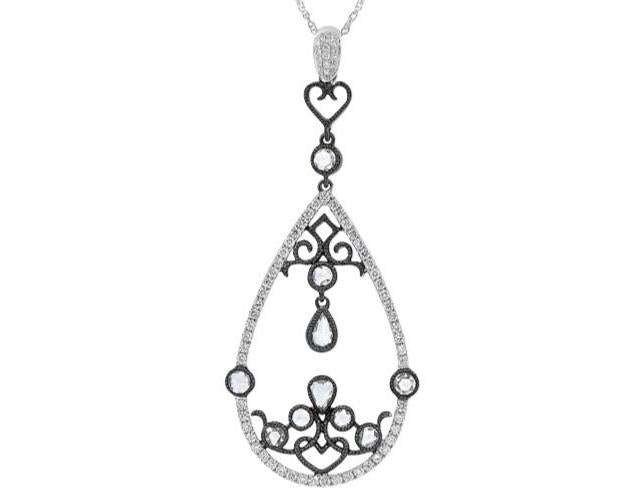 1.20CT WHITE & BLACK DIAMOND 18KT WHITE GOLD TEAR DROP OPEN FILIGREE FUN PENDANT