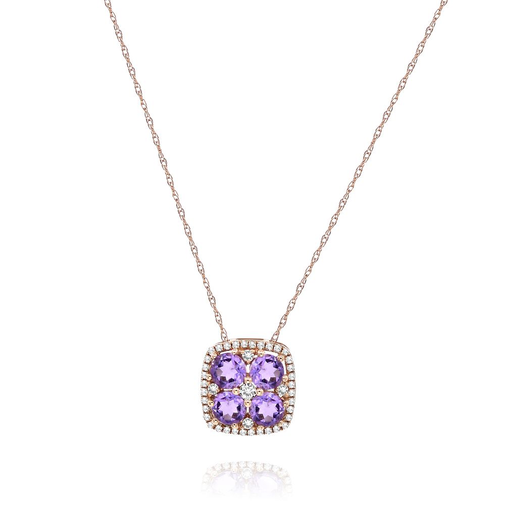 14KT ROSE GOLD FLOATING PENDANT. 3D CLUSTER FLOWER SQUAREDESIGN. DIAMONDS ARE F/G COLOR, VSSI CLARITY .23 CARATS. AAA AMETHYSTS ARE .98 CARATS.COMES ON A 14KT GOLD DIAMOND CUT 16" INCH CHAIN.WRITTEN APPRAISAL AVAILABLE. COMES IN A PRESENTABLE GIFT BOX.