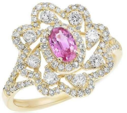 14KT YELLOW GOLD FUN RING. 3D FLOWER DESIGN. ROUND DIAMONDS ARE F/G COLOR, VSSI CLARITY .74 CARATS. AAA OVAL PINK SAPPHIRE IS .47 CARATS. RING SIZE 7. CAN BE SIZED BY OUR MASTER JEWELER UPON REQUEST. WRITTEN APPRAISAL AVAILABLE. COMES IN A PRESENTABLE GIFT BOX.