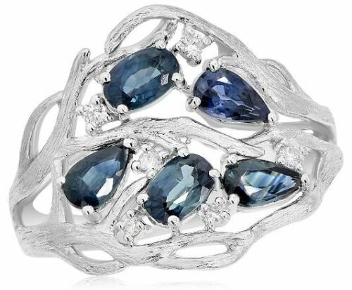 14KT WHITE GOLD FUN RING. 3D LEAF NATURE DESIGN. DIAMONDS ARE F/G COLOR, VSSI CLARITY .09 CARATS. AAA OVAL AND PEAR SHAPE SAPPHIRES ARE 1.12 CARATS. RING SIZE 7. CAN BE SIZED BY OUR MASTER JEWELER UPON REQUEST. WRITTEN APPRAISAL AVAILABLE. COMES IN A PRESENTABLE GIFT BOX.