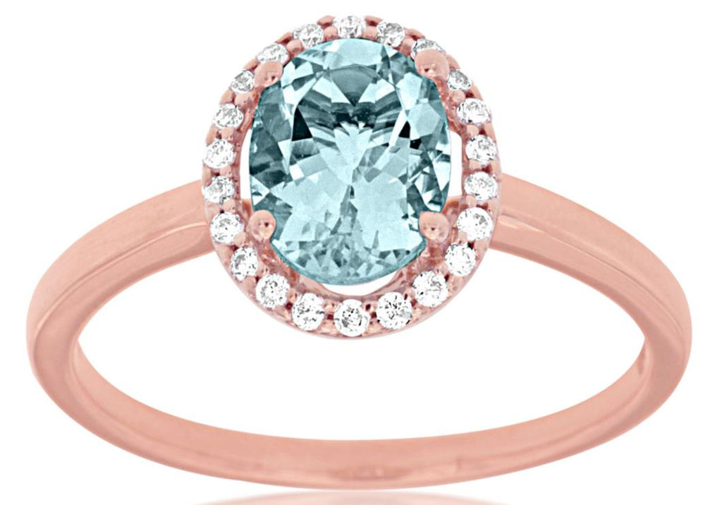 1.22CT DIAMOND & AAA AQUAMARINE 14KT ROSE GOLD OVAL & ROUND HALO ENGAGEMENT RING