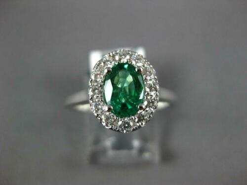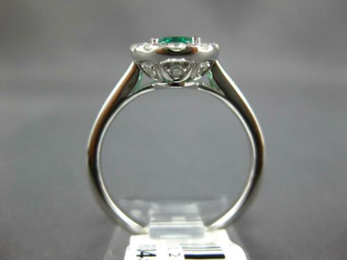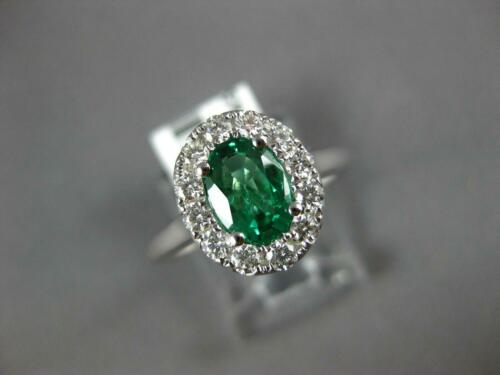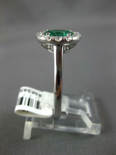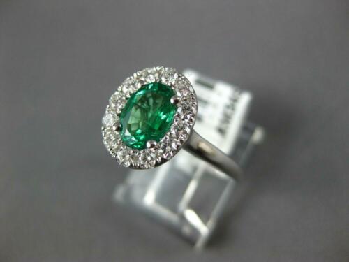 18KT WHITE GOLD ENGAGEMENT RING. 3D CLASSIC HALO DESIGN. ROUND DIAMONDS ARE F/G COLOR, VSSI CLARITY .44 CARATS. AAA OVAL EMERALD IS .78 CARATS. EMERALD MEASURES 7.3mm X 5.5mm. RING MEASURES 11.5mm WIDE. RING SIZE 7. CAN BE SIZED BY OUR MASTER JEWELER UPON REQUEST. WRITTEN APPRAISAL AVAILABLE. COMES IN A PRESENTABLE GIFT BOX.