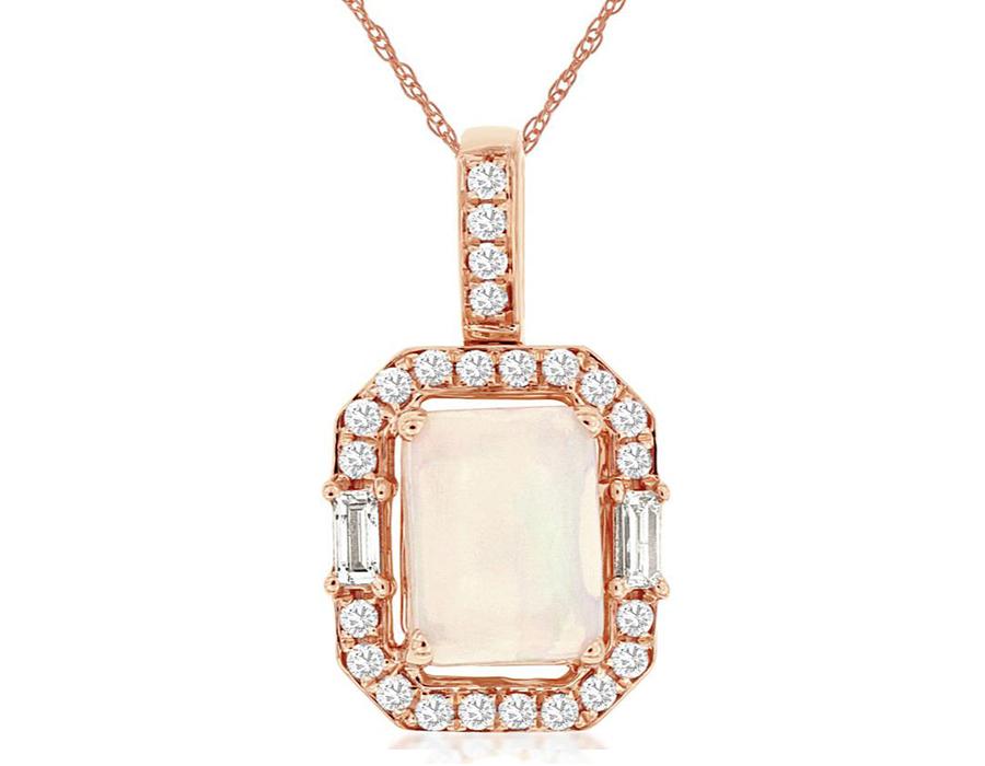 14KT ROSE GOLD FLOATING PENDANT. 3D SQUARE HALO OCTAGON DESIGN. ROUND AND BAGUETTE DIAMONDS ARE F/G COLOR, VSSI CLARITY .27 CARATS. AAA BAGUETTE OPAL IS .95 CARATS. COMES ON A 14KT GOLD DIAMOND CUT 18" INCH CHAIN. WRITTEN APPRAISAL AVAILABLE. COMES IN A PRESENTABLE GIFT BOX.