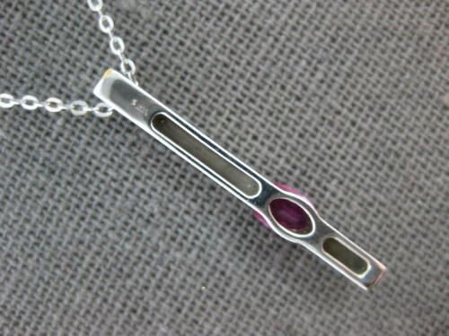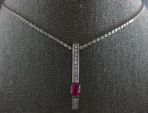 14KT WHITE GOLD LOVE FLOATING PENDANT. 3D BAR DESIGN. ROUND DIAMONDS ARE F/G COLOR, VSSI CLARITY .20 CARATS. AAA OVAL RUBY IS 1.02 CARATS. MEASURES 29mm X 4mm. COMES ON A 14KT GOLD DIAMOND CUT 16" INCH CHAIN. WRITTEN APPRAISAL AVAILABLE. COMES IN A PRESENTABLE GIFT BOX.