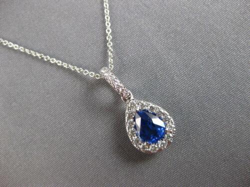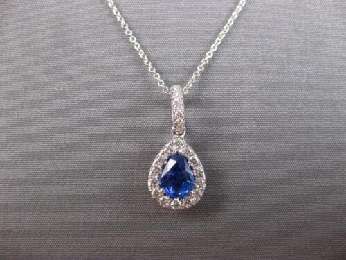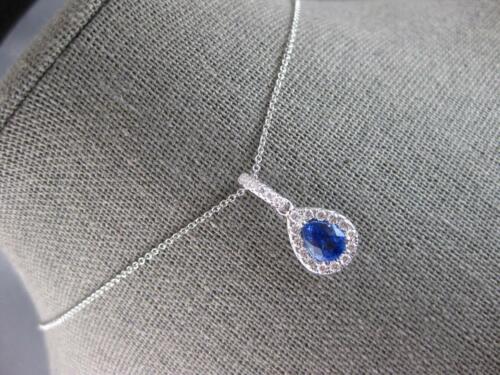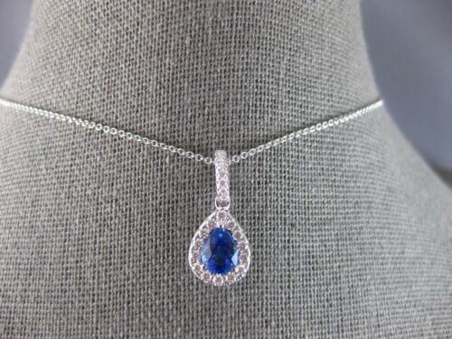 14KT WHITE GOLD FLOATING PENDANT. 3D CLASSIC HALO DESIGN. ROUND DIAMONDS ARE F/G COLOR, VSSI CLARITY .28 CARATS. AAA PEAR SHAPE CEYLON SAPPHIRE IS .95 CARATS. CEYLON SAPPHIRE MEASURES 7mm X 5mm. PENDANT MEASURES 19mm X 9mm. COMES ON A 14KT GOLD DIAMOND CUT 18" INCH CHAIN. WRITTEN APPRAISAL AVAILABLE. COMES IN A PRESENTABLE GIFT BOX.