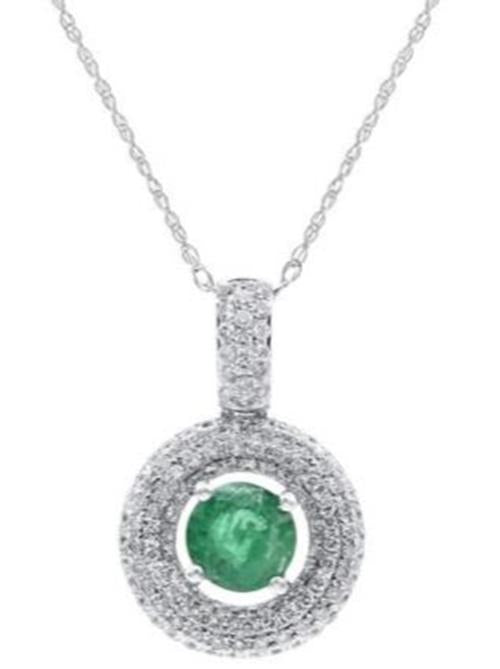 14KT WHITEGOLD FUNPENDANT. 3D SOLITAIRE CLASSIC HALODESIGN. DIAMONDS ARE F/G COLOR, VSSI CLARITY .55CARATS. AAA EMERALDSIS .68CARATS.COMES ON A 14KT GOLD DIAMOND CUT 16" INCH CHAIN.WRITTEN APPRAISAL AVAILABLE. COMES IN A PRESENTABLE GIFT BOX.
