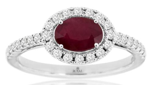 14KT WHITE GOLD ENGAGEMENT RING. 3D CLASSIC HALO SIDEWAYS DESIGN. ROUND DIAMONDS ARE F/G COLOR, VSSI CLARITY .33 CARATS. AAA OVAL RUBY IS .90 CARATS. RING SIZE 7. CAN BE SIZED BY OUR MASTER JEWELER UPON REQUEST. WRITTEN APPRAISAL AVAILABLE. COMES IN A PRESENTABLE GIFT BOX.