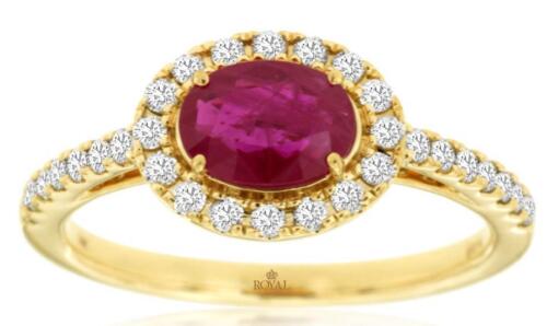 14KT YELLOW GOLD ENGAGEMENT RING. 3D SIDEWAY HALO DESIGN. ROUND DIAMONDS ARE F/G COLOR, VSSI CLARITY .33 CARATS. AAA OVAL RUBY IS .90 CARATS. RING SIZE 7. CAN BE SIZED BY OUR MASTER JEWELER UPON REQUEST.
