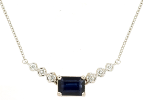 14KT YELLOW GOLD LOVE NECKLACE. 3D CLASSIC DESIGN. ROUND DIAMONDS ARE F/G COLOR, VSSI CLARITY .14 CARATS. AAA EMERALD CUT SAPPHIRE IS 1.09 CARATS. 17" INCHES LONG. WRITTEN APPRAISAL AVAILABLE. COMES IN A PRESENTABLE GIFT BOX.