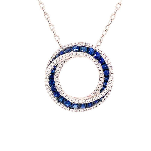 18KT WHITE GOLD FLOATING PENDANT. 3D CIRCULAR LOVE KNOT DESIGN. DIAMONDS ARE F/G COLOR, VSSI CLARITY .42 CARATS. AAA SAPPHIRES ARE .81 CARATS. COMES ON A 14KT GOLD DIAMOND CUT 16" INCH CHAIN.