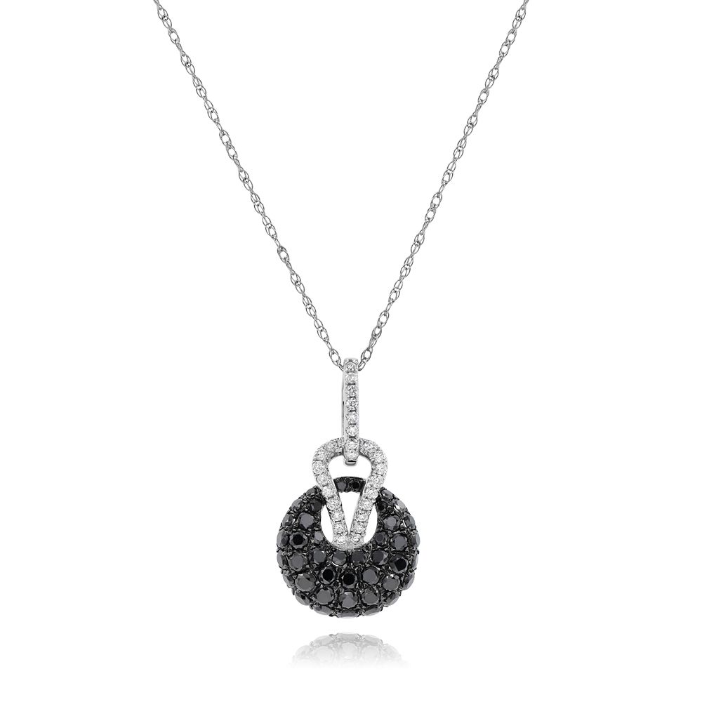 14KT WHITE GOLD PENDANT. 3D CIRCULAR LOVE KNOTDESIGN. DIAMONDS ARE F/G COLOR, VSSI CLARITY. 20 CARATS. BLACK DIAMONDS ARE 1.03 CARATS. COMES ON A 14KT GOLD DIAMOND CUT 16" INCH CHAIN.WRITTEN APPRAISAL AVAILABLE. COMES IN A PRESENTABLE GIFT BOX.
