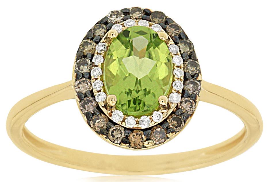 1.23CT WHITE & MOCHA DIAMOND & AAA PERIDOT 14K YELLOW GOLD OVAL & ROUND FUN RING