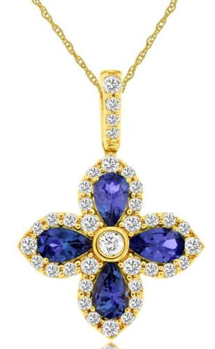 14KT YELLOW GOLD FLOATING PENDANT. 3D FLOWER DESIGN. ROUND DIAMONDS ARE F/G COLOR, VSSI CLARITY .40 CARATS. AAA EXTRA FACETED PEAR SHAPE TANZANITES ARE .85 CARATS. COMES ON A 14KT GOLD DIAMOND CUT 16" INCH CHAIN. WRITTEN APPRAISAL AVAILABLE. COMES IN A PRESENTABLE GIFT BOX.
