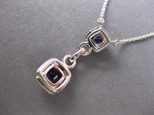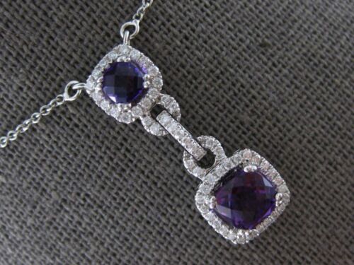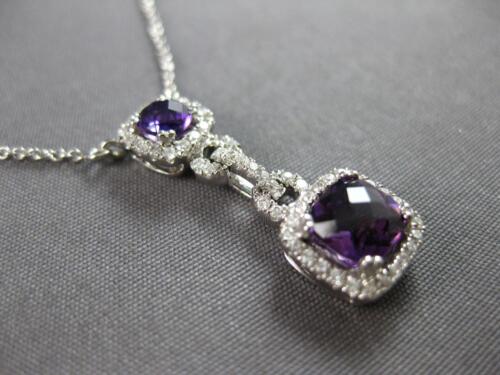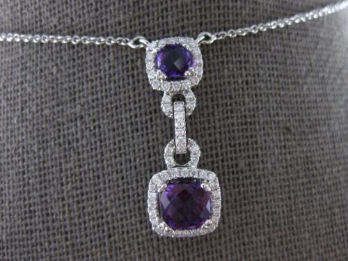 14KT WHITE GOLD FUN LARIAT NECKLACE. 3D DOUBLE SQUARE LOVE KNOT DESIGN. ROUND DIAMONDS ARE F/G COLOR, VSSI CLARITY .25 CARATS. AAA EXTRA FACETED CUSHION CUT AMETHYSTS ARE 1.01 CARATS. MEASURES 24.5mm X 9mm. " INCHES LONG. WRITTEN APPRAISAL AVAILABLE. COMES IN A PRESENTABLE GIFT BOX.