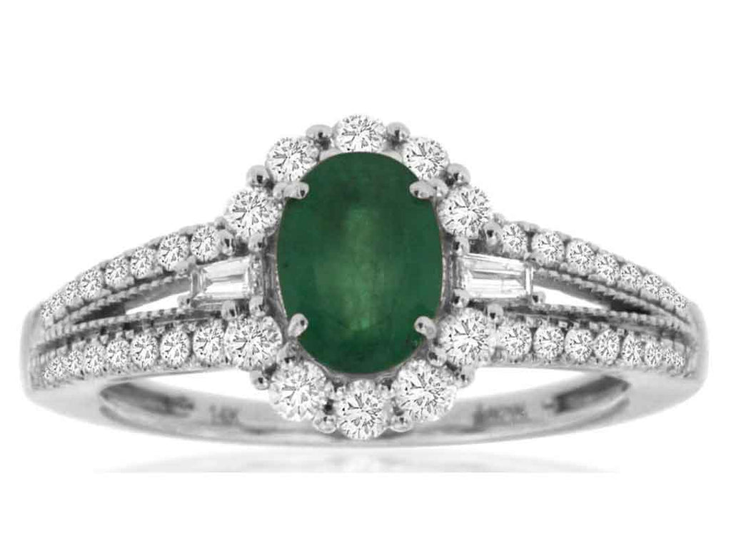 14KT WHITE GOLD ENGAGEMENT RING. 3D FILIGREE DESIGN. ROUND AND BAGUETTE DIAMONDS ARE F/G COLOR, VSSI CLARITY .56 CARATS. AAA OVAL EMERALD IS .70 CARATS. RING SIZE 7. CAN BE SIZED BY OUR MASTER JEWELER UPON REQUEST.