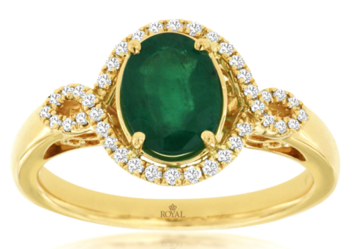 14KT YELLOW GOLD LOVE RING. 3D HALO INFINITY DESIGN. ROUND DIAMONDS ARE F/G COLOR, VSSI CLARITY .16 CARATS. AAA OVAL EMERALD IS 1.10 CARATS. RING SIZE 7. CAN BE SIZED BY OUR MASTER JEWELER UPON REQUEST. WRITTEN APPRAISAL AVAILABLE. COMES IN A PRESENTABLE GIFT BOX.