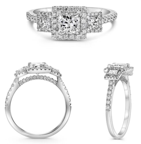 1.26CT DIAMOND PLATINUM 3D ROUND & PRINCESS CLASSIC 3 STONE HALO ENGAGEMENT RING