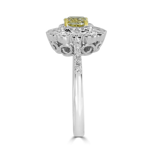 18KT WHITE AND YELLOW GOLD ENGAGEMENT RING. 3D FLOWER FILIGREE DESIGN. ROUND WHITE DIAMONDS ARE F/G COLOR, VSSI CLARITY .69 CARATS. CUSHION CUT FANCY YELLOW DIAMOND IS .58 CARATS. RING SIZE 7. CAN BE SIZED BY OUR MASTER JEWELER UPON REQUEST. WRITTEN APPRAISAL AVAILABLE. COMES IN A PRESENTABLE GIFT BOX.