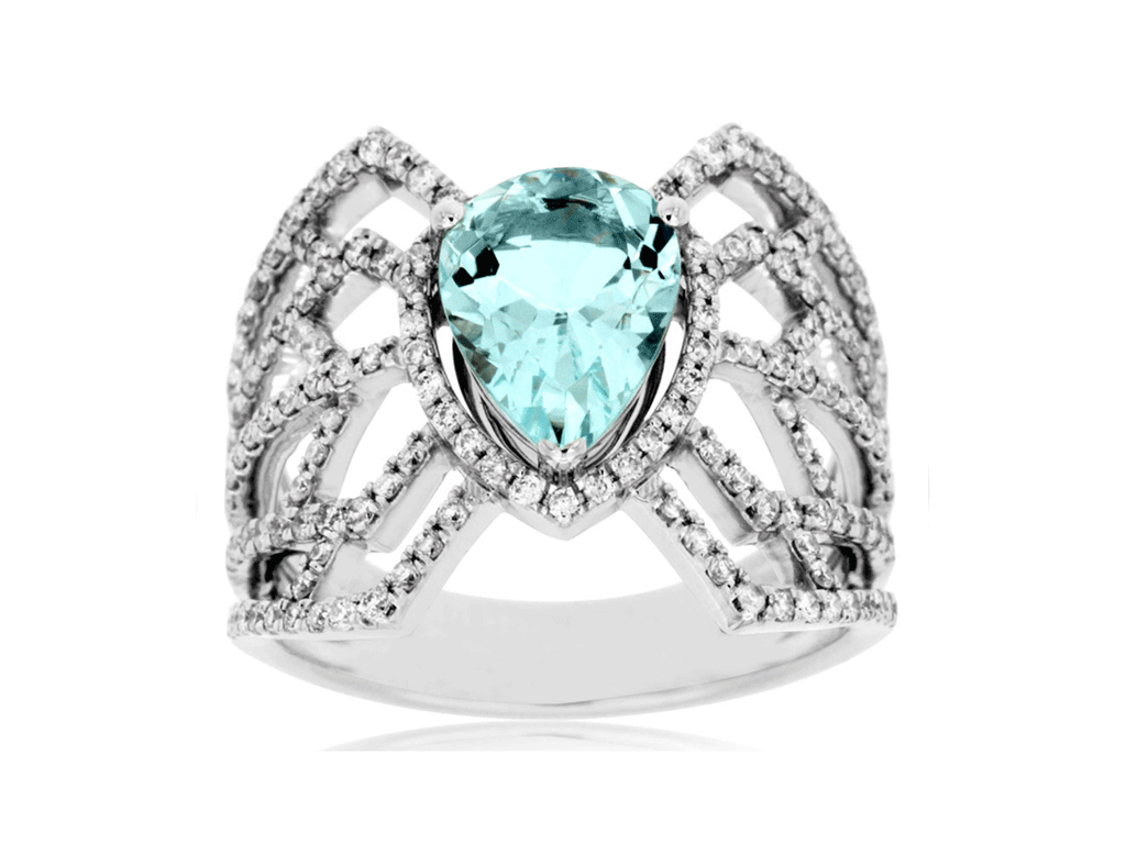 14KT WHITE GOLD FUN ANNIVERSARY RING. 3D OPEN FILIGREE DESIGN. ROUND DIAMONDS ARE F/G COLOR, VSSI CLARITY .74 CARATS. AAA EXTRA FACETED PEAR SHAPE AQUAMARINE IS 1.55 CARATS. RING SIZE 7. CAN BE SIZED BY OUR MASTER JEWELER UPON REQUEST. WRITTEN APPRAISAL AVAILABLE. COMES IN A PRESENTABLE GIFT BOX.