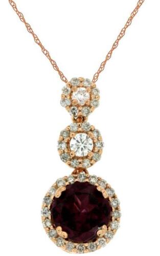 14KT ROSE GOLD FLOATING PENDANT. 3D HALO FLOWER JOURNEY DESIGN. ROUND DIAMONDS ARE F/G COLOR, VSSI CLARITY .29 CARATS. AAA EXTRA FACETED ROUND RHODOLITE IS 1.0 CARAT. COMES ON A 14KT GOLD DIAMOND CUT 16" INCH CHAIN.