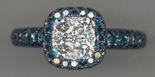 14KT WHITE GOLD FRIENDSHIP LOVE RING. 3D CLUSTER SQUARE DOUBLE HALO DESIGN. WHITE DIAMONDS ARE F/G COLOR, VSSI CLARITY .48 CARATS. BLUE DIAMONDS ARE .81 CARATS. RING SIZE 7. CAN BE SIZED BY OUR MASTER JEWELER UPON REQUEST. WRITTEN APPRAISAL AVAILABLE. COMES IN A PRESENTABLE GIFT BOX.