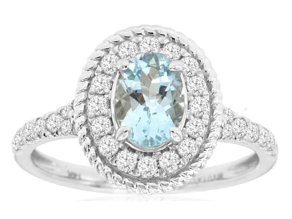 1.2CT DIAMOND & AAA AQUAMARINE 14KT WHITE GOLD OVAL & ROUND FILIGREE FLOWER RING