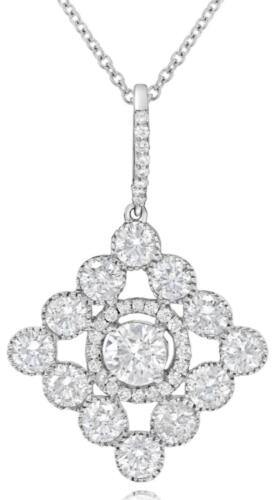 18KT WHITE GOLD FUN FLOATING PENDANT. 3D CLASSIC FLOWER SQUARE SOLITAIRE GEOMETRICAL DESIGN. ROUND DIAMONDS ARE F/G COLOR, VSSI CLARITY 1.30 CARATS. COMES ON A 14KT GOLD DIAMOND CUT 16" INCH CHAIN.