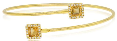 18KT YELLOW GOLD BANGLE BRACELET. 3D SQUARE CRISS CROSS FLEXIBLE DESIGN. ROUND DIAMONDS ARE F/G COLOR, VSSI CLARITY .13 CARATS. AAA EXTRA FACETED PRINCESS CUT CITRINES ARE 1.18 CARATS. FITS UP TO 7" INCH WRIST.