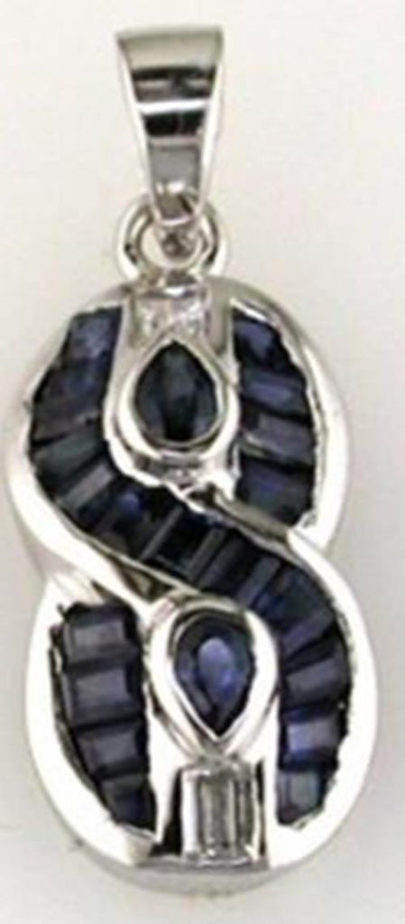 14KT WHITE GOLD LOVE PENDANT. 3D INFINITY DESIGN. DIAMONDS ARE F/G COLOR, VSSI CLARITY .06 CARATS. AAA MULTI SHAPE SAPPHIRES ARE 1.25 CARATS.COMES ON A 14KT GOLD DIAMOND CUT 16" INCH CHAIN.WRITTEN APPRAISAL AVAILABLE. COMES IN A PRESENTABLE GIFT BOX.