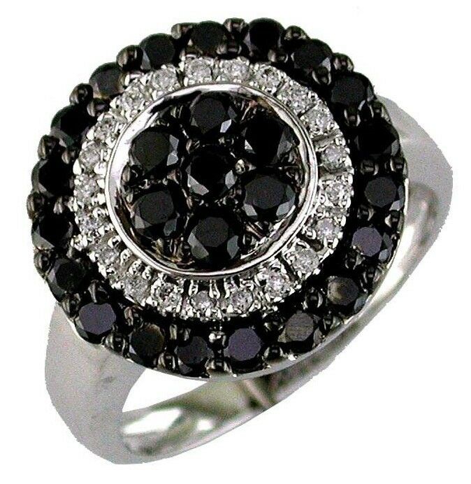 14KT WHITE GOLD LOVE RING. 3D CLASSIC CLUSTER FLOWER DESIGN. WHITE DIAMONDS ARE F/G COLOR, VSSI CLARITY .12 CARATS. BLACK DIAMONDS ARE 1.20 CARATS. CAN BE SIZED BY OUR MASTER JEWELER UPON REQUEST. WRITTEN APPRAISAL AVAILABLE. COMES IN A PRESENTABLE GIFT BOX.