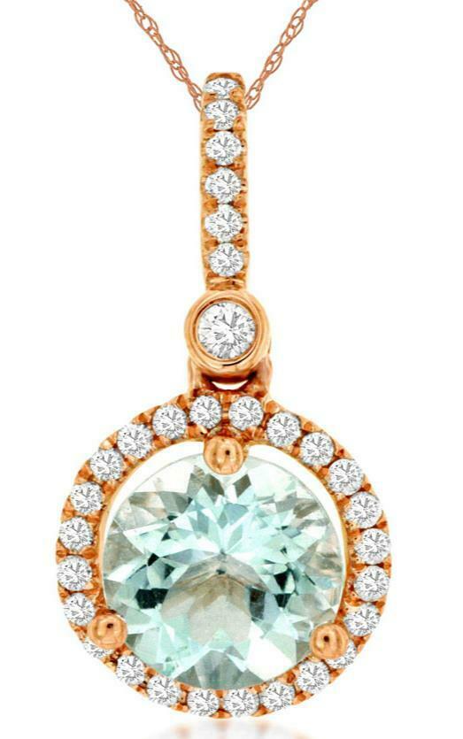 14KT ROSE GOLD FLOATING PENDANT. 3D ROUND HALO CLASSIC DESIGN. ROUND DIAMONDS ARE F/G COLOR, VSSI CLARITY .18 CARATS. AAA AQUAMARINE IS 1.15 CARATS. COMES ON A 14KT GOLD DIAMOND CUT 18" INCH CHAIN. WRITTEN APPRAISAL AVAILABLE. COMES IN A PRESENTABLE GIFT BOX.