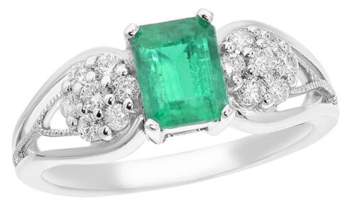 14KT WHITE GOLD ENGAGEMENT RING. 3D DOUBLE FLOWER DESIGN. ROUND DIAMONDS ARE F/G COLOR, VSSI CLARITY .37 CARATS. AAA EMERALD CUT COLOLBIAN EMERALD IS .96 CARATS. RING SIZE 7. CAN BE SIZED BY OUR MASTER JEWELER UPON REQUEST. WRITTEN APPRAISAL AVAILABLE. COMES IN A PRESENTABLE GIFT BOX.