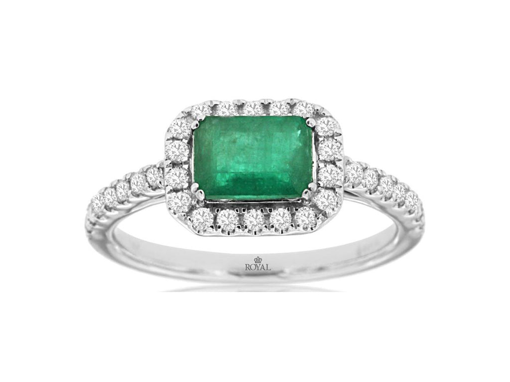 14KT WHITE GOLD FRIENDSHIP LOVE RING. 3D HALO DESIGN. ROUND DIAMONDS ARE F/G COLOR, VSSI CLARITY .33 CARATS. AAA BAGUETTE EMERALD IS 1.0 CARAT. RING SIZE 7. CAN BE SIZED BY OUR MASTER JEWELER UPON REQUEST. WRITTEN APPRAISAL AVAILABLE. COMES IN A PRESENTABLE GIFT BOX.