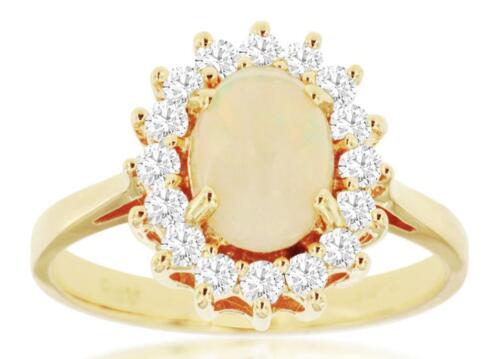 14KT YELLOW GOLD FRIENDSHIP LOVE RING. 3D FLOWER DESIGN. ROUND DIAMONDS ARE F/G COLOR, VSSI CLARITY .43 CARATS. AAA OVAL OPAL IS .90 CARATS. RING SIZE 7. CAN BE SIZED BY OUR MASTER JEWELER UPON REQUEST. WRITTEN APPRAISAL AVAILABLE. COMES IN A PRESENTABLE GIFT BOX.