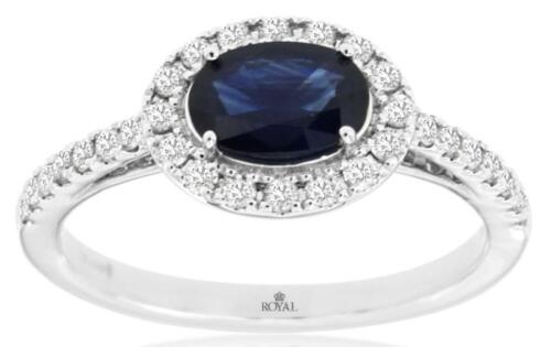 14KT WHITE GOLD ENGAGEMENT RING. 3D HALO SIDEWAYS DESIGN. ROUND DIAMONDS ARE F/G COLOR, VSSI CLARITY .33 CARATS. AAA OVAL SAPPHIRE IS 1.0 CARAT. RING SIZE 7. CAN BE SIZED BY OUR MASTER JEWELER UPON REQUEST. WRITTEN APPRAISAL AVAILABLE. COMES IN A PRESENTABLE GIFT BOX.