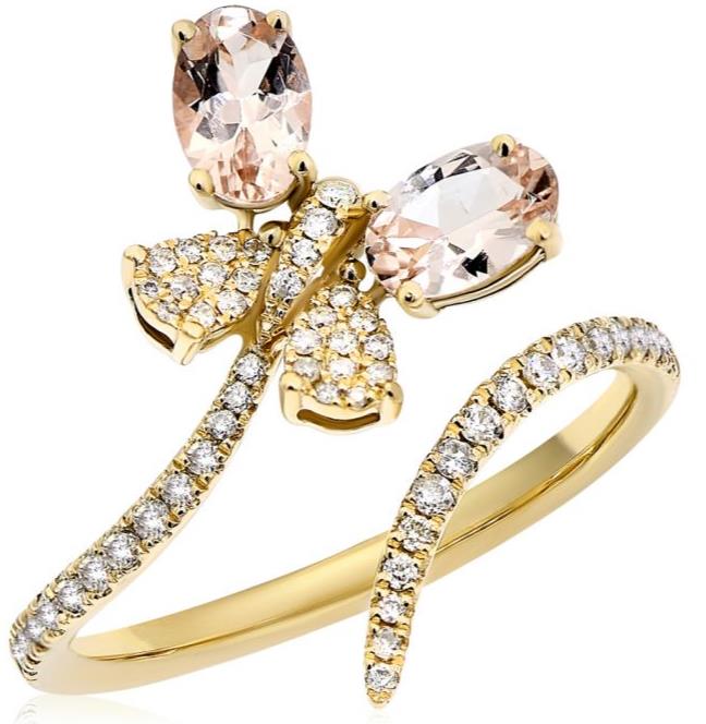 1.34CT DIAMOND & AAA MORGANITE 14KT YELLOW GOLD ROUND & OVAL BUTTERFLY LOVE RING