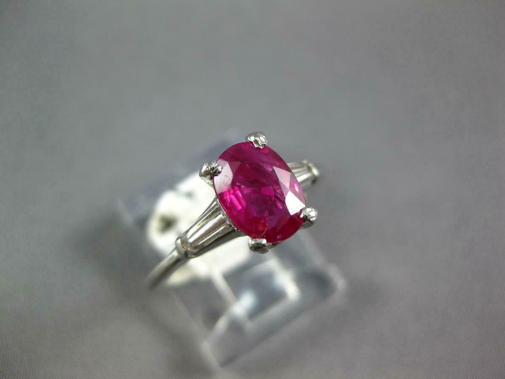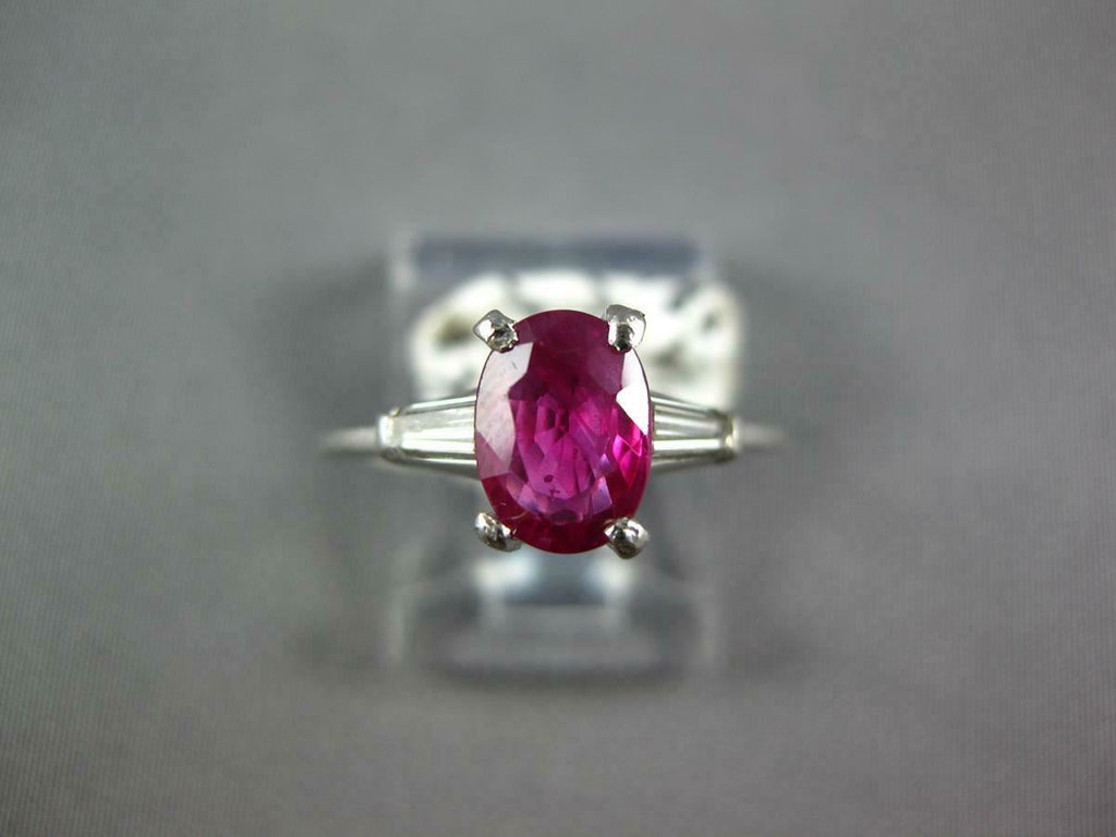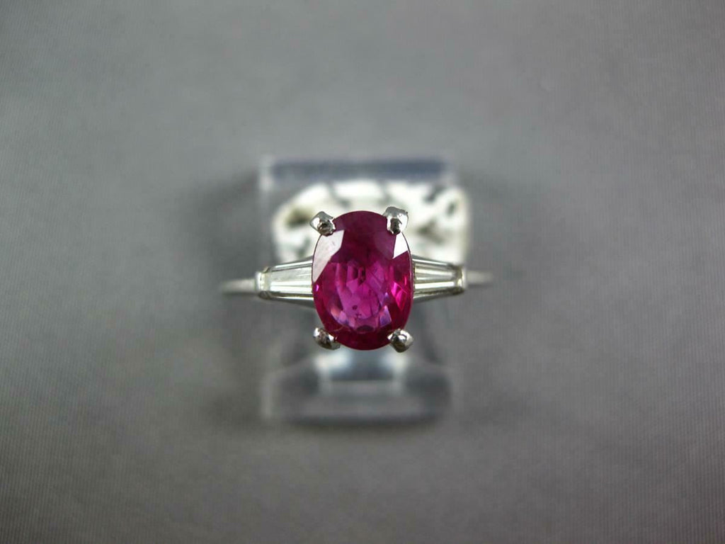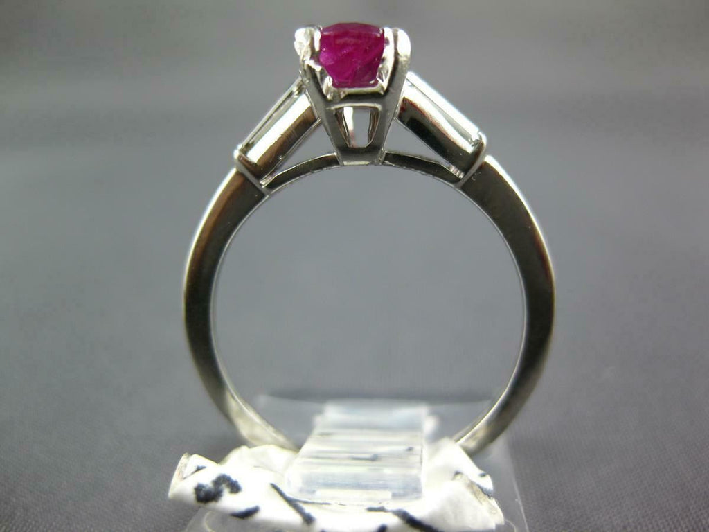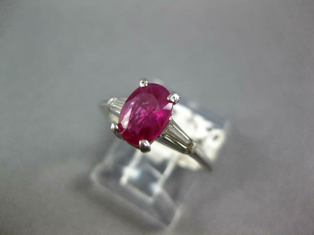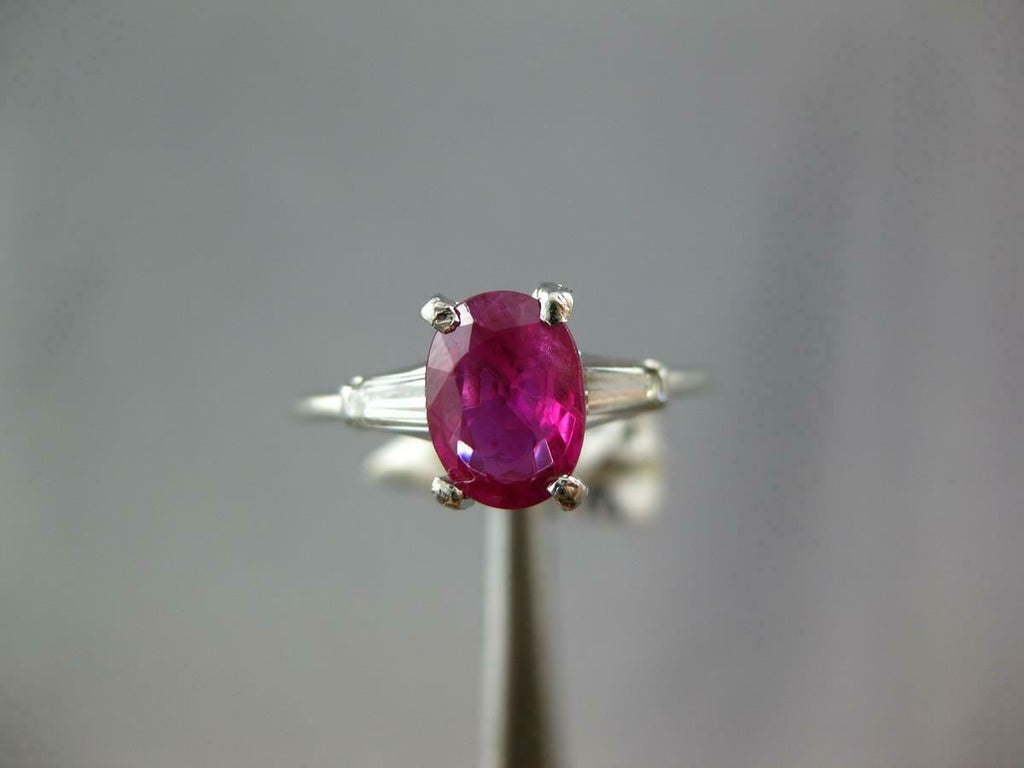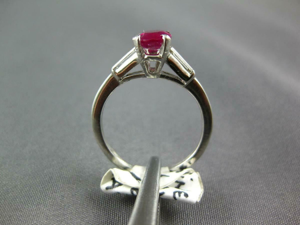 PLATINUM ENGAGEMENT RING. 3D THREE STONE DESIGN. BAGUETTE DIAMONDS ARE F/G COLOR, VS CLARITY .28 CARATS. AAA OVAL RUBY IS 1.06 CARATS. MEASURES 7mm WIDE. RING SIZE 5.25. CAN BE SIZED BY OUR MASTER JEWELER UPON REQUEST. WRITTEN APPRAISAL AVAILABLE. COMES IN A PRESENTABLE GIFT BOX.